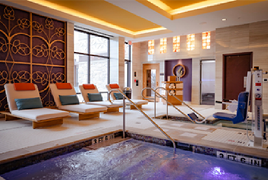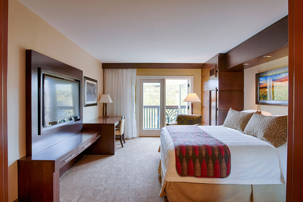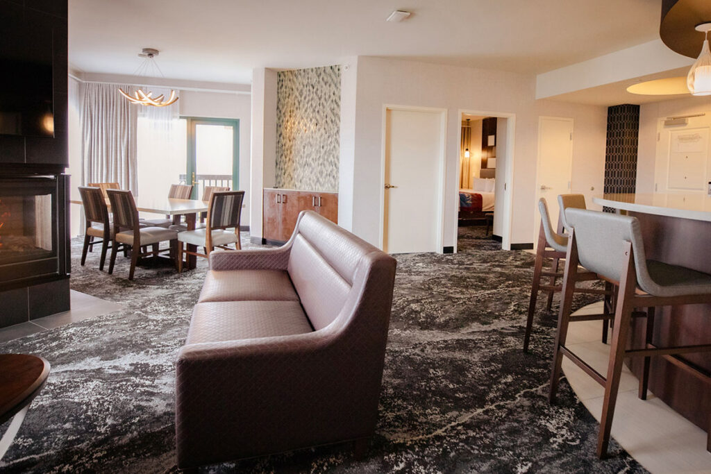 The Sunrise Tower Three Bay Suite features one king size bed, a HD TV, cable, free WiFi, large desk with desk chair, entertainment area with bar, dining table with 6 chairs, bartenders pantry with full size fridge, fireplace, patio with corner view, half bathroom, and full bathroom with deep tub/walk in shower combo.